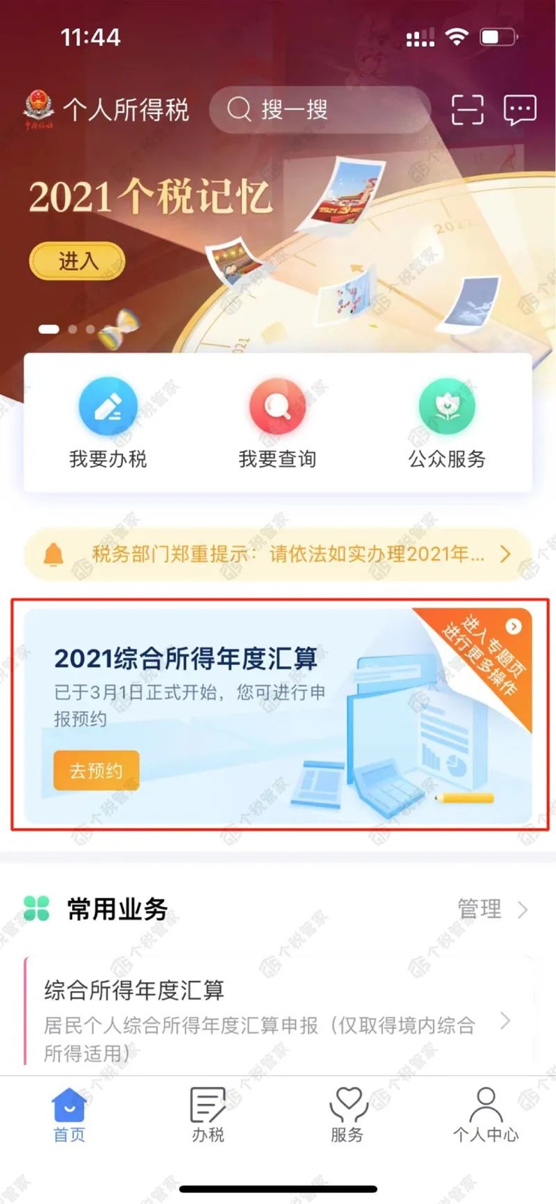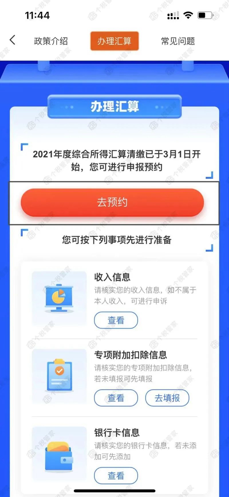登錄個稅APP首頁,選擇【2021綜合所得年度匯算】--【去預約】。