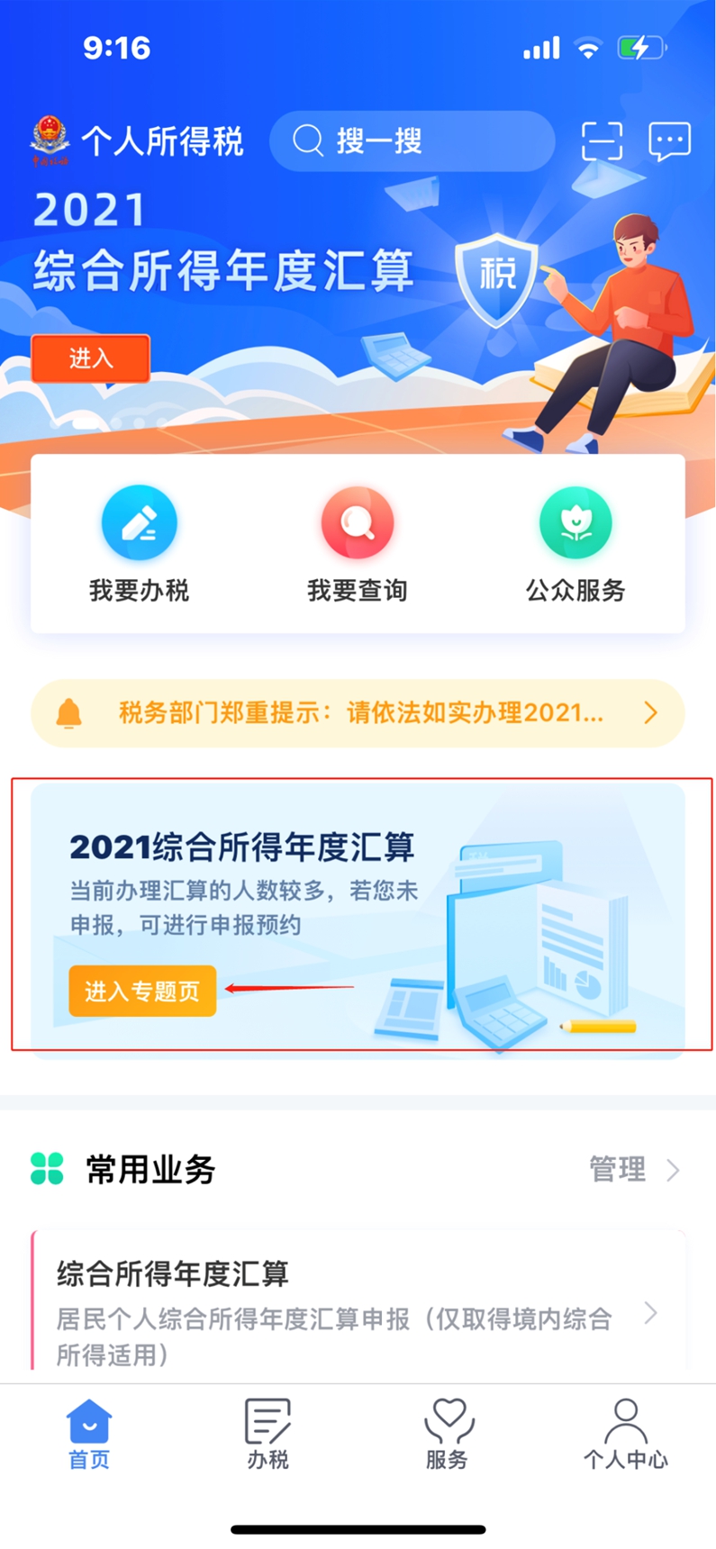 登錄個稅APP--找到2021綜合所得年度匯算,點【進入專題頁】