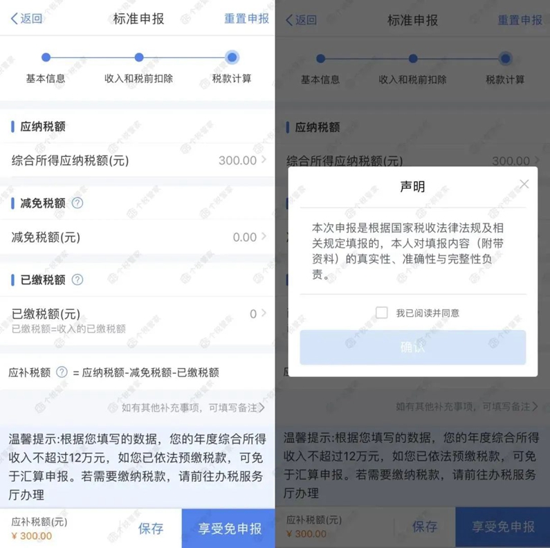 7.如果在標準申報頁面,提示有應補稅額,在年收入不足12萬元或者補稅金額≤400元的情況下,可以點【享受免申報】。
