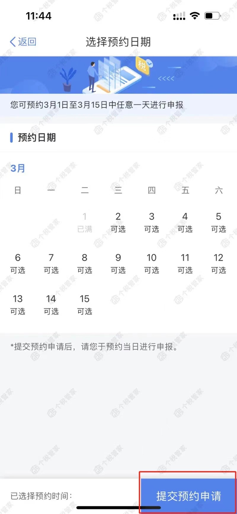 2.選擇日期,提交預約申請,即可預約成功。